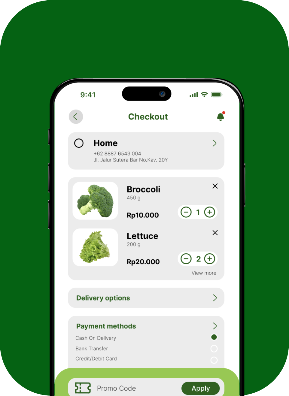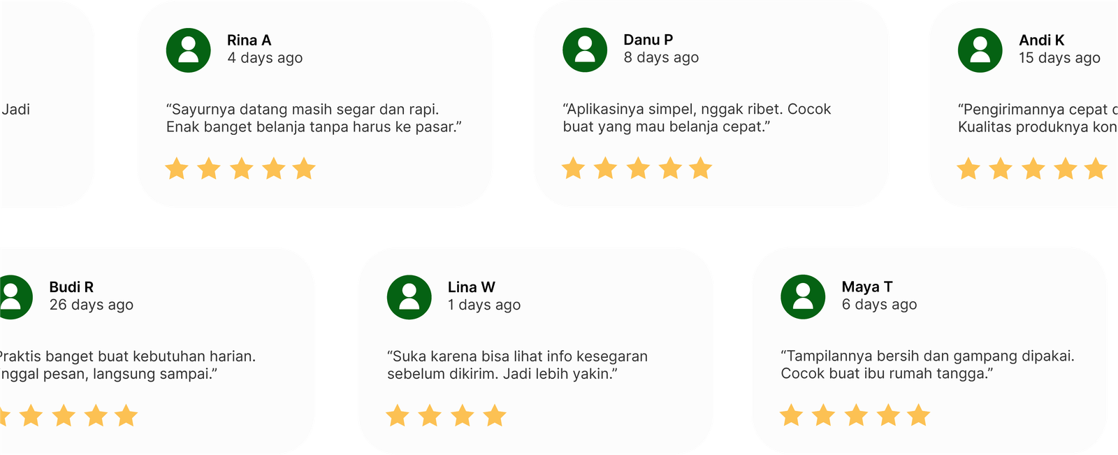 digunakanFitur yang Membuat Belanja Lebih Tenang Kesegaran TransparanCheckout TransparanStok Real TimeJadwal Pengiriman PastiLihat tingkat kesegaran dan foto produk sebelum dikirimHarga dan ongkir langsung jelas sejak awalBelanja lebih pasti dengan stok yang selalu diperbaruiWaktu kirim jelas dan bisa disesuaikan kebutuhanmuBelanja Segar dalam 3 Langkah Mudah Jelajahi berbagai sayur dan buah segar yang dipilih langsung dari sumber terpercaya.Atur pesanan dengan harga dan ongkir yang transparan, tanpa kejutan di akhir.Pesanan dikemas rapi dan dikirim tepat waktu agar tetap segar saat diterima.Belanja segar kini semudah scroll dan klik1. Temukan Pilihanmu2. Checkout Pilihanmu3. Dikirim dengan PerhatianBelanja Kamu, Dampak Nyata Mendukung Petani LokalMembantu petani lokal mendapatkan akses pasar langsung dan pendapatan yang lebih stabilMengurangi Food WasteSistem stok terkontrol membantu mengurangi bahan segar yang terbuangHidup Lebih SehatMemudahkan keluarga mengakses bahan segar untuk kebutuhan harianApa Kata Mereka?Mulai Belanja Segar Tanpa Ribet Unduh SegerIn sekarang dan rasakan pengalaman belanja bahkan segar yang lebih praktis, jujur, dan terpercayaBelanja bahan segar jadi lebih mudahKontribusi SegerIn terhadap Dampak SDGSJl. Kemang Raya No. 25,